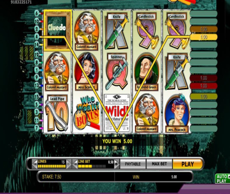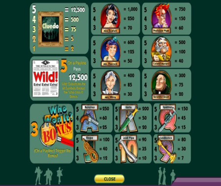 Para quienes no estén familiarizados con el Clue, o Cluedo, este es un juego de misterio en el que los participantes intentan descubrir al asesino entre varios sospechosos, así como el arma utilizada y el escenario del crimen en la mansión, basándose en pistas que se van revelando durante el juego. La tragamonedas sigue esta intrigante narrativa, presentando símbolos que representan a los personajes del juego, así como iconos tradicionales de cartas como As, Rey, Reina, Jota, 10 y 9. Cada símbolo también está asociado a un arma: el As representa un revólver, el Rey un martillo, la Reina un candelabro, la Jota una cuerda, el 10 una espada y el 9 una llave inglesa. Los personajes incluyen a Miss Scarlett, Mrs. White, Professor Plum, Colonel Mustard y Reverend Green. También se hallan el símbolo comodín de Cluedo y el símbolo disperso de periódico. Todos los símbolos se animan y presentan con asombrosas gráficas.